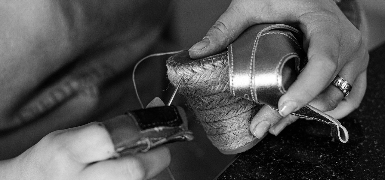 Bei der Herstellung der Espadrilles von Fred de la Bretoniere wird zunächst ein Seil aus Jute in eine ovale Form geflochten. Dieses Geflecht wird dann in einer extra dafür vorgesehenen Schale gedreht. Anschließend wird das Produkt in eine weitere Gussform gelegt, in der die Sohle in das richtige Format gedrückt wird. Anschließend wird die Gummilauffläche darunter vulkanisiert (gebacken).